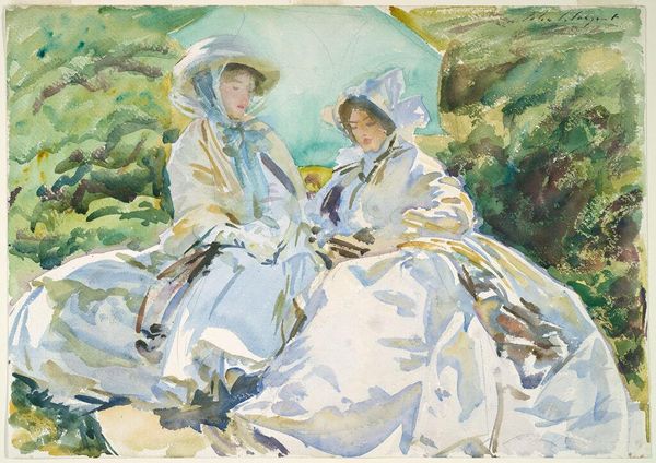 Editor: This is John Singer Sargent’s “Simplon Pass. Reading,” created in 1911, a watercolor painting now in the Museum of Fine Arts, Boston. It’s… luminous, almost ethereally bright. The contrast between the upright figure and the reclining one is very striking. What do you see in this piece, from a formalist perspective? Curator: The immediate draw is, indeed, the luminescence, achieved through masterful manipulation of watercolor's inherent transparency. Note how Sargent layers washes to create depth and shadow, yet never loses the vibrancy of light. Observe the juxtaposition of textures: the flowing fabric of the dress against the more roughly defined landscape elements. Editor: Yes, the way the white dress is rendered, it’s almost abstract in places. It doesn’t feel like the solid fabric of a garment. Curator: Precisely! And it is within this tension between representation and abstraction that much of the painting's energy resides. Consider how the composition guides our eye, from the lower foliage upwards toward the figures, culminating in the contrasting postures and gazes. It is a deliberate, controlled movement. Where does your eye naturally go after that? Editor: Probably back down to the dress, because it takes up so much of the image. And the texture contrasts sharply with everything else, which feels muted. It pulls me in for a closer look. Curator: Note the almost geometric shapes employed within the figures, especially visible in the bonnet and the reclining figure's dress. These shapes are simplified, yet the painting retains a sense of realism through the modulation of color and tone. Sargent emphasizes the interplay between line and wash. It’s a dialogue in artistic language. Editor: I see what you mean – almost architectural in their structure. Looking closely, the dress itself almost ceases to be just a dress! I never would have noticed that without your pointing out the geometric structures. Thank you.