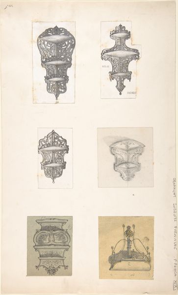 This monochrome print presents six studies of ornamented consoles from the city hall in Nancy. The anonymous photographer captures the intricate stonework with a sharp, documentary eye, emphasizing texture and form. Each console, framed within its architectural setting, presents a unique sculptural face peering out at the viewer. Notice how the composition leverages repetition and variation. The consistent framing allows for a comparative study of each sculpture's distinct character, drawing attention to the play of light and shadow that animates each face. The high contrast enhances the tactile quality of the stone, revealing the marks of the sculptor's chisel. This systematic approach aligns with structuralist methods, inviting us to decode the visual language of architectural ornamentation. What meanings might these grotesque masks have conveyed to the citizens of Nancy? Perhaps they served as symbolic guardians, warding off malevolence while asserting civic pride through their intricate, almost theatrical designs. The artwork invites us to consider the symbolic power embedded within architectural forms and their role in shaping social identity.