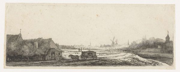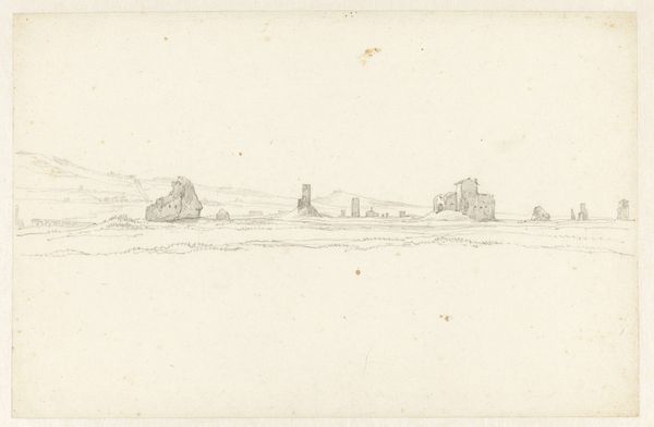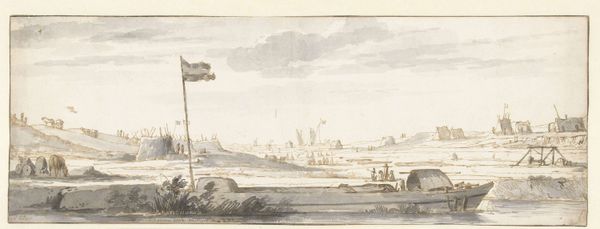 Curator: Here we have "Polder Landscape," a drawing in ink on paper, attributed to Roelant Roghman and currently residing here at the Rijksmuseum. Editor: It feels melancholic, almost desolate. The subtle grey tones, the way the lines just barely capture the scene… it speaks of transience. Curator: The polder is a powerful symbol, isn't it? Land reclaimed from water. For the Dutch, it embodies perseverance, human ingenuity against the force of nature. Think about what it represents psychologically: the constant striving for stability in an ever-changing world. Editor: And at what cost? We romanticize the "reclaiming," but fail to address the disruption it causes to pre-existing ecosystems, the erasure of a natural state. Look how muted and restrained the composition is. Roghman, perhaps unintentionally, reveals this violence. Where's the vibrancy? Curator: Consider it instead a subtle representation of order. The clean lines of the land divisions. That sense of contained energy. It’s less about outright conquest and more about negotiation, finding harmony. Editor: But harmony for whom? Who benefits from this meticulously crafted order? Historically, polders have been linked to shifting power dynamics, resource control. Look at the tiny figures along the horizon – they appear insignificant in contrast to the landscape’s dominating presence. It whispers about who controls this "harmony." Curator: Still, don’t dismiss the quiet strength implied in the land itself. Notice how it sits stubbornly in the space. Roghman subtly conveys resilience through his restrained use of line. It invites contemplation and honors the land’s enduring character. Editor: Maybe you’re right. Perhaps there is more depth here than my initial reaction suggested. That melancholic tone still resonates but maybe also alludes to collective struggle that reshaped this landscape into a testament of its time. Curator: Precisely. Every line tells a story. Editor: Ultimately it highlights the complexities that shaped it into its present day form.