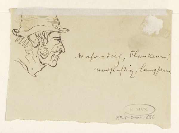 Johannes Tavenraat created 'Koppen', an ink drawing, on a small piece of paper. The composition is dominated by three profile sketches of men wearing hats, interspersed with seemingly unrelated numbers. The stark contrast between the delicate lines of the portraits and the more assertive, numerical annotations creates a visual tension. The artist has used the formal structure of the page to evoke a sense of fragmentation. Each portrait is rendered with precise lines that capture the unique character of the figures. Tavenraat seems to play with semiotics by presenting a study of human likeness, but alongside an ambiguous set of numbers, inviting us to consider the potential symbolic meanings behind this juxtaposition. By emphasizing line and form, Tavenraat disrupts conventional expectations and invites us to decode the relationship between representation and abstraction.
