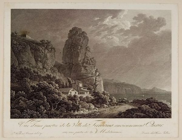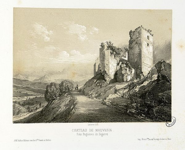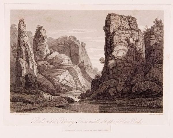 Curator: This is "Roches Rocks and Hermitage" by John Pye the Younger, housed right here at the Harvard Art Museums. Editor: My first thought? A sense of stark isolation, beautifully rendered. The rocks jut out like teeth from the landscape. Curator: It’s a study in contrasts, isn't it? The rough, natural forms of the rocks against the straight lines of the hermitage ruins. One wonders about the socio-economic status of hermits during this period and the social context of their patrons. Editor: Yes, and the scale! The figures are so tiny, dwarfed by the sheer mass of nature. It makes you think about our own insignificance, doesn’t it? I feel like I'm observing a dream, or a memory. Curator: Indeed. Thank you for providing a reflective insight. Editor: And thank you for illuminating the historical context.