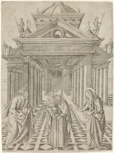 Marcantonio Raimondi created this engraving, Martha Leading Mary Magdalene, in the early 16th century. The eye is drawn to the stark contrasts and the dynamic arrangement of figures ascending the steps. Observe how Raimondi employs line and space to create a sense of depth. The composition is structured around the rising steps and architectural elements, framing a narrative about moral transformation and spiritual redemption. The figures are meticulously rendered, yet the architectural setting carries symbolic weight. The temple, rendered with classical precision, is a backdrop that signifies a transition from earthly to divine spaces. Raimondi’s use of perspective invites us to consider our own position relative to the scene—are we among the observing crowd, or are we implicated in the drama unfolding on the steps? This question challenges us to examine the social and religious structures that define our perceptions of morality and spirituality. We’re left to consider the symbolic meaning of each carefully etched line.