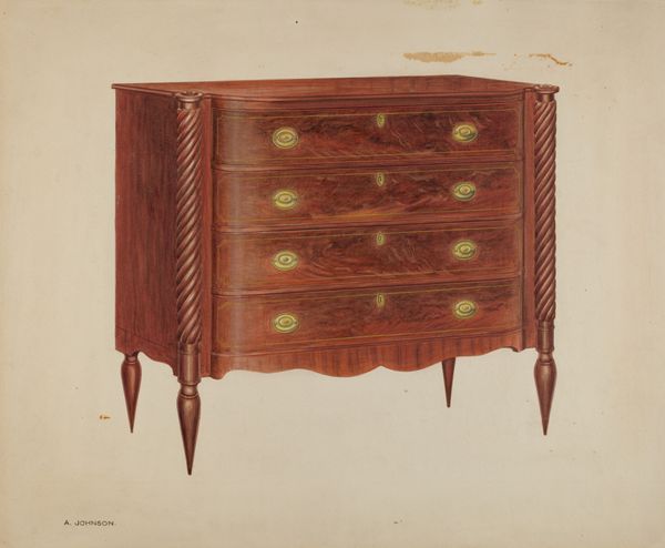 Curator: Well, this watercolor work by Isadore Goldberg, dated around 1939, presents a rather formal "Chest with Drawer". Editor: It feels muted. The palette is earthy, and there's an intimacy to the composition, given the direct perspective. It exudes functionality—it could be from anywhere. Curator: The very ordinariness is interesting! This watercolor is a medium that’s historically associated with studies and preparatory sketches. The fact that Goldberg chose it to represent this chest suggests the labor process is relevant, making us wonder if there’s more than meets the eye. Editor: I'd like to think so, though what’s the history here? Why depict such a mundane object? Perhaps this was commissioned. Was Goldberg attempting to elevate craft and commonplace into 'fine art' during the pre-war period? What public exhibitions, if any, would’ve showcased a piece like this? Curator: Excellent points! Think about the cultural anxieties and aspirations of the time, maybe this resonated with audiences craving stability, domesticity. The material itself—watercolor on paper—is modest. Were artists seeking accessible means of expression in a time of economic hardship? Or maybe Goldberg’s style represents the democratization of art; challenging established norms of acceptable subjects? Editor: Maybe this painting reflects a specific style valued within art institutions and public perceptions of “taste." Did the artwork adhere to the stylistic conventions expected during that period? And how might that tie into public funding or patronage influencing the artist? Curator: Definitely worth researching further. The drawing method feels so restrained and precise that makes you imagine that it would almost look like a furniture catalogue image. Editor: On reflection, this gives pause for thought about representation. Maybe there's significance in Goldberg recording items designed for use, transforming them into something aesthetic within cultural values? Curator: Agreed. And what a simple image that makes me reflect! Editor: A domestic portal through someone's personal belonging... Interesting how an image changes everything we might presume!