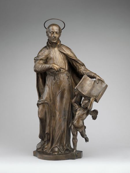 Curator: This is Bessie Potter Vonnoh's bronze sculpture, "Girl Reading," created in 1897. Editor: I'm struck by the stillness, that absorbed focus. It's quiet, domestic... very intimate for a sculpture. Curator: Vonnoh was deeply influenced by the Arts and Crafts movement. Her work often celebrated idealized notions of womanhood, beauty and domesticity, countering industrialization's effects on turn-of-the-century society. She carved a niche capturing the grace of everyday moments, often depicting women in repose. Editor: The material choice really reinforces that connection to domesticity and craft. Bronze offers a warmth that colder materials like marble wouldn’t achieve. I'm also noticing the dress—the way it drapes and flows; the making is emphasized almost as much as the figure herself. Curator: Indeed, it embodies the stylistic preference of that era: naturalism softened with sentimentality. Vonnoh exhibited extensively, and her work resonated widely, demonstrating an appeal for art reflecting middle-class values and aspiration during that period. Her works offered, really, a subtle form of social commentary on idealized domestic life. Editor: How do you see that subtle social commentary manifesting? I mean, to my eye, it presents this image without obvious conflict or interrogation. More observation of this casting reveals that some aspects were made to appear 'unfinished', like it came straight out of the ground. Was that a popular aesthetic for sculpture then, in contrast to the machine made, perhaps? Curator: Certainly. There’s a conscious decision to embrace the handmade in that era. But for Vonnoh specifically, these works served to provide idealized types, images of gentility and private life in a rapidly urbanizing environment where women sought visibility in the arts. She sold many of her sculptures and reliefs. Editor: Considering the labor then... from conception to execution, what would a sculpture like this have entailed? How many hands would have been involved in this bronze work before it reaches an audience? Curator: Likely several, including the artist, foundry workers specializing in casting and finishing, and possibly assistants for some stages. Each would bring specialized skills in modeling, mold-making, and metalworking. The means of production themselves carry significance. Editor: It gives me so much to consider the way materiality and manufacture are implicated in even the seemingly most straightforward portraiture, and to ponder its position and purpose at that specific moment in time. Curator: Absolutely. And for me, considering how deeply this image was embraced in public taste illuminates what values and attitudes shaped art production in America at the end of the 19th century.