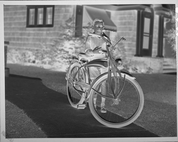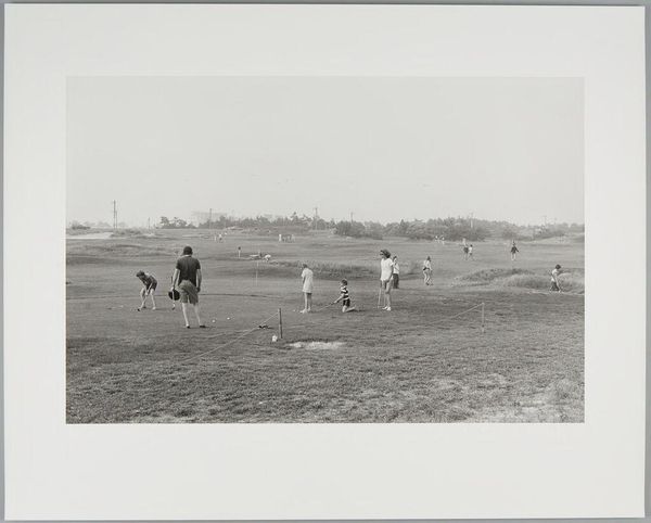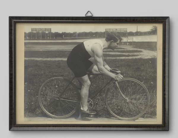 Editor: This is an untitled photograph by Jack Gould, showing a boy with a bike watching football practice. It feels like a very ordinary scene, but I wonder what it might say about spectatorship and masculinity. What do you see in it? Curator: It is fascinating to consider the photograph as a staging of intersectional experiences. How does the image speak to gender roles, the culture of sports, and perhaps even class dynamics, through its quiet depiction of a boy observing a masculine ritual from the sidelines? Editor: That's a great point. It makes you wonder about the boy's own identity and his relationship to the players. I did not think about that before. Curator: Exactly. This image invites us to think about who is included, who is excluded, and the power structures at play. It makes one think about the unseen pressures on young people.