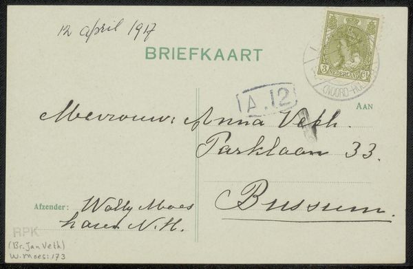 This postcard was sent to Anna Dorothea Dirks in 1914 by Wally Moes; it’s a little tableau of personal communication, caught in a moment of transit. The marks are simple: handwriting in dark ink, the blocky green sans-serif of "BRIEFKAART", a stamp in the upper right corner. I think of the materiality of this gesture. The paper has aged, the ink has faded slightly, but the energy of the writing remains. It’s casual, personal, a little bit sloped, like the marks are leaning in toward the addressee. Look at the way ‘Bussum’ is underlined with a confident flourish! This piece connects to a wider theme in art history: the use of text as image, of script as a gesture. It makes me think of Cy Twombly’s scribbled paintings, but on a miniature scale. Like Twombly, Moes lets the energy of the hand speak. It’s a reminder that art is not just about the final product but about the act of making, the intention, and the connection it creates.
