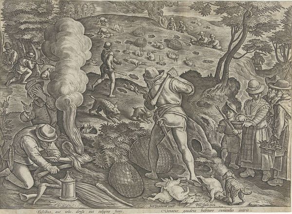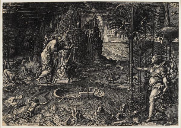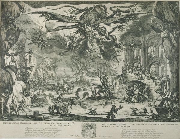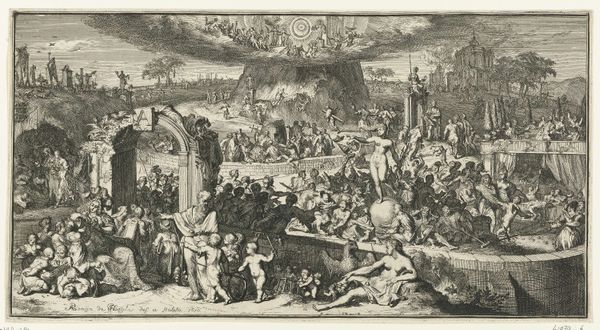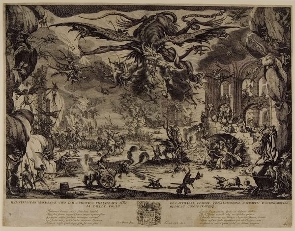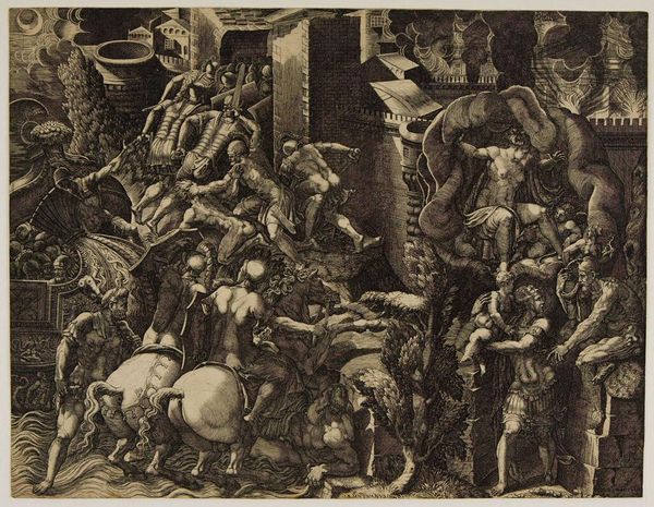 Curator: Well, that’s quite a scene! Before us, we have Jacob Isaacsz. van Swanenburg’s oil painting, "The Last Judgment and the Seven Deadly Sins," painted sometime between 1600 and 1638. It’s like stepping into a nightmare, isn't it? Editor: Utter chaos! I’m immediately struck by this sense of swirling dread. It's a vision of hellscape, quite literally. A visual overload of fleeing figures and fiery destruction. My initial impression is overwhelmingly… apocalyptic. Curator: Apocalyptic indeed! Swanenburg was quite keen on dramatic, theatrical narratives. This piece clearly aims to depict the moral and spiritual consequences of sin. Remember, this was a period steeped in religious fervor and a fascination with moralizing tales. Look at how the landscape itself seems to mirror the inner turmoil of the figures. Editor: The composition is rather unusual, wouldn't you say? Almost split in two. On one side, it feels like a more classical inferno with ruins ablaze, while the other has this gathering under…is that a massive serpent or some primeval beast? It's quite the contrast in representation of the same horrific theme. Curator: Exactly. The beast symbolizes the lurking danger of temptation, a constant threat even in what might appear to be mundane surroundings. The gathering huddling beneath are enacting their mortal sins, completely oblivious to the disaster around the corner. You can almost hear their wicked whispers! It reveals how moral failing permeates the lives of the everyday people. Editor: I see, so it is about social commentary in addition to religious morality. What about those nude figures scattered around? Are they symbolic of loss of innocence, perhaps? The vulnerable exposure that comes with being judged? Curator: It can certainly be interpreted that way. The nudity, particularly in a religious context, is a display of vulnerability and ultimate lack of control when facing judgment. In terms of style, the artist blends traditional landscape with Mannerist elements – see the exaggerated figures, and swirling smoky forms! He masterfully combines all these various things, capturing the period's anxious vision of morality and humanity. Editor: So, less a portrait of judgment, and more an invitation to examine one’s own ethical landscape? Quite a heavy contemplation to take away from a single viewing! Curator: Indeed. Swanenburg provides a fascinatingly turbulent window into a time when morality and destiny were intensely debated. What’s fascinating to me is thinking how artists negotiate power, perception and piety in turbulent epochs. Editor: It truly has me thinking... Perhaps our contemporary anxieties aren't that different, really.