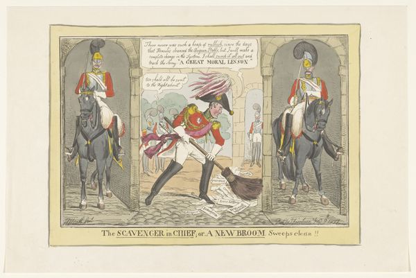Curator: This print, attributed to J. Lewis Marks, is titled "The Three Gentlemen of Verona on a Legitimate Crusade, or the Cry of Blood." Likely created in 1823, it provides a satirical look at King Louis XVIII and the Congress of Verona. Editor: Immediately striking is its caricature style, the way figures are exaggerated. The color palette is muted, and the etching line-work precise. The overall feeling is of constrained chaos and absurdity. Curator: It certainly reflects a specific moment in European politics. The Congress of Verona in 1822 saw European powers discussing intervention in Spain to restore the Bourbon monarchy. This print cleverly criticizes that agenda, portraying it as a farcical, self-serving crusade by the 'Three Gentlemen' from Verona. Editor: Yes, note the visual layering: a road sign, indicating a ‘dangerous road to Verona', dominates the middle ground behind the main characters. There is John Bull trying to intervene and the composition cleverly isolates and caricatures the three allied 'gentlemen.' It reads top to bottom and each part makes it increasingly critical. Curator: Exactly. And look at who is hauling them. Labeled "Slaves of the Holy Alliance". This imagery encapsulates how the great powers exploit weaker nations to advance their reactionary goals. Editor: I notice, particularly, the contrasting textures: the smoothness of the royal figures, especially the ones directing the whole affair and those poor souls pushing their elaborate transport who look positively haggard! This juxtaposition intensifies the message. Curator: Political prints like this played a crucial role in shaping public opinion in the 19th century. By visually ridiculing the actions of monarchs, artists like Marks challenged authority. This critique could have resonated broadly among citizens weary of continuous war. Editor: The entire scene is cleverly staged. A mix of symbolism and overt mockery to effectively communicates its anti-establishment viewpoint to a wide audience, something achieved with great compositional and expressive line-work. Curator: This piece showcases how art engaged directly with its social context, serving as a form of protest. Editor: And, beyond the message, we see an inventive and very skilled printmaker at work, turning political critique into a lively image.