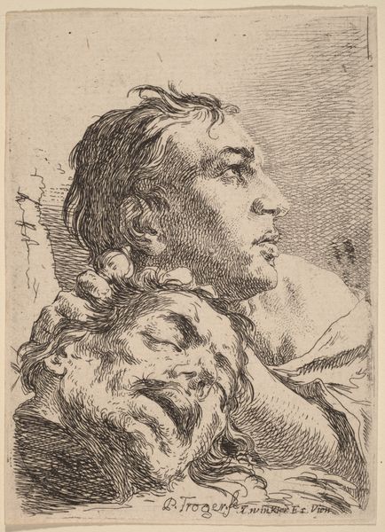 Curator: Immediately, I feel like I've walked into a salon. The romantic kind, filled with poetry recitations and furtive glances. Editor: This drawing, "Head of a Young Man Looking Right," was completed in 1774 by Jakob Matthias Schmutzer. Schmutzer, a prominent figure, made this using print and drawing techniques. Look at how he combines those two approaches. Curator: Print and drawing? Oh, yes, it's like a moment captured, but also meticulously etched in time. The lines aren’t just lines, are they? It feels as though he’s been unearthed—found rather than made. The gaze, especially, it's the most gentle longing. What sort of paper did they use back then for such works? Editor: Most likely a laid paper, the kind with visible lines from the papermaking process. You can almost feel the texture, I suppose. Given the way the drawing is printed, it gives this work some reproducible features, it is, essentially, made for sharing through copies of the art, allowing greater audiences to see Schmutzer's work beyond an original drawing's exclusive domain. Curator: Aha, that almost seems… revolutionary for the time? To make art not just for the elite, but for distribution? It gives the artwork a double meaning - and even makes that quiet, gentle longing seem more universal and accessible. The medium shapes the message. Editor: Precisely. The red chalk gives it a certain warmth, doesn't it? That speaks to materiality. It's interesting how choosing such a material lends itself to portray this romantic vision you're suggesting - it creates an almost accessible aesthetic for that "elite". This suggests class dynamics at play, wouldn't you say? Curator: Certainly a deliberate artistic choice, then, and a clever one, because now I’m pondering about everything this lad dreamt about as a subject to this romantic artwork. Red chalk turns out to be more subversive than one might have given it credit for. Editor: So, while seemingly a portrait, we start thinking about distribution, about technique, about its place in material history... suddenly a simple drawing invites complex layers of reading. Curator: It just reminds us that art can sometimes be a portal—a quick sketch might also be a looking glass into the dreams and circumstances that conceived it.