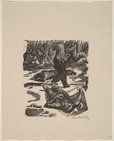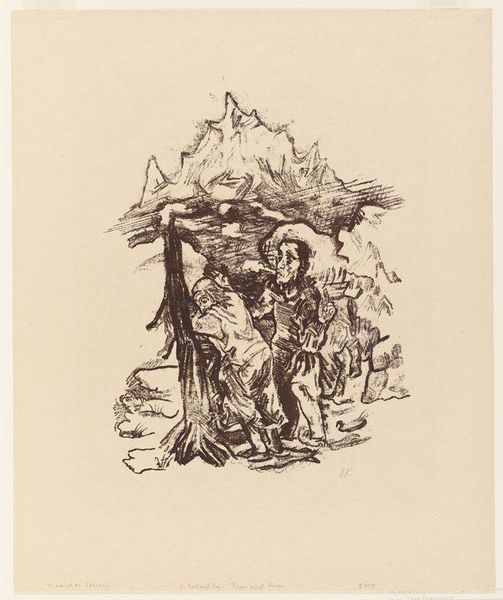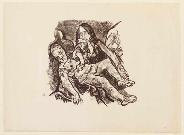 Curator: Oh, the drama! The tension is palpable, isn’t it? Editor: It's raw, certainly. Look at the frantic hatching of lines – this print, a lithograph by Oskar Kokoschka, immediately unsettles. "Pietà", made in 1914, presents a somber scene, mirroring the Virgin Mary cradling the body of Christ, yet charged with an…urgent emotion. Curator: Yes, a rawness! The distorted figures, especially the person holding the other – the intensity in their eyes and posture makes my heart ache. There is an angst, not unlike some sort of dark premonition... Kokoschka was right on the edge of something awful. It feels profoundly personal. Do you think it mirrors his anxieties from the lead up to the first world war? Editor: That would definitely fall within Kokoschka's typical production scope during that period. The quickness of line here is deceptive – lithography is hardly instantaneous. But its reproducibility meant such expressions, rooted in emotion, could disseminate quickly. It bypasses the art world entirely and lands straight onto streets, and printed as book illustrations like this one, into peoples homes. A commentary in itself on the way such suffering and distress was impacting civilian life in the 1910s Curator: And doesn't that amplify the emotion? I mean, to see this replicated across the city, across the country...it turns personal suffering into something communal. Grief then becomes a shared burden. Isn't it kind of extraordinary, too, that even though this work relies on Christian symbolism, the emotional impact has remained completely relevant? No particular faith is needed to interpret the power in such vulnerable intimacy and deep grief Editor: Absolutely. Although the 'subject' may present a Christian iconography in name, Kokoschka has brought this history-painting into a totally contemporary setting through the means of his distinct expressionist style, and accessibly printed material. It moves beyond its original confines and religious implications. I think about the role of printmaking for social change; It would have brought art, and commentary to working class and middle class people who wouldn't be in the usual galleries or able to afford paintings at all. Curator: So true! So, we’re looking at a potent expression, cleverly wrought by the artist at this moment in history with great impact. Thanks to industrial technology, and ingenuity, the work can take on the important role of the dissemination of otherwise very personal, very human expressions, right? Editor: Yes, from his anxieties onto the streets and into the minds of a new audience who understood intimately his sentiments. And now into our ears... it brings the subject and context to light in an important way.