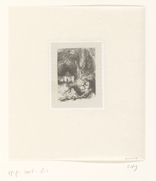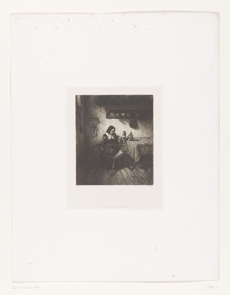 Editor: This is “Heilige Familie met engelen,” or “Holy Family with Angels,” by Nikolay Semyonovich Mosolov, likely created sometime between 1857 and 1914. It's a print, an etching on paper, and the scene feels so intimate and dreamlike. I'm struck by how the figures seem suspended between the earthly and the divine. How do you interpret this work? Curator: This print invites us to consider the evolving representations of motherhood and family in the late 19th and early 20th centuries. While seemingly traditional, its symbolic style can be viewed as a subtle commentary on the idealized, often unattainable, image of domesticity propagated during that era. Consider the labor involved, both physical and emotional. Does the inclusion of angels serve to elevate the maternal figure, or perhaps highlight the burdens placed upon her by societal expectations and religious doctrine? What do you make of that duality? Editor: That’s interesting. I initially saw it as a straightforward religious image, but thinking about the expectations placed on women at that time definitely shifts my perspective. The etching's fine lines create such a soft, ethereal quality. I wonder if that contributes to the feeling of the mother being almost overwhelmed. Curator: Precisely. The delicate nature of the medium can be read as fragility. This piece speaks volumes about the Madonna figure and family structures. The angels, perhaps, also allude to the lack of tangible worldly support for new mothers and children. Editor: So, you're saying the "symbolism" might be speaking to contemporary issues about family structures? I guess, at the time, what issues might families and mothers encounter? Curator: The pressures on mothers to conform to societal ideals, the challenges of raising children with limited resources, the imbalance of domestic labor, to name a few. This work, though seemingly traditional, quietly questions those structures, subtly offering a perspective that acknowledges the complex realities of womanhood and motherhood. Editor: This has really broadened my understanding. I thought I was just seeing a historical print, but it holds so much social commentary, and brings in a more social approach to the symbolism within the artwork! Curator: Exactly! And hopefully that is something you will carry on with your work. Now when you view similar art you can consider the impact on marginalized people, in both the artist’s time and in ours.