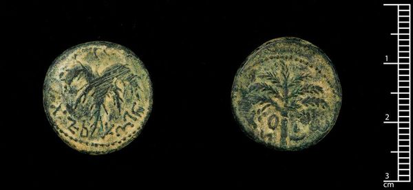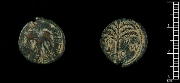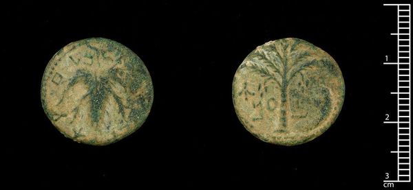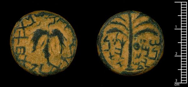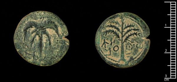 Editor: Here we have a coin of Bar Kokhba. What strikes me is its simplicity, and the way it seems to connect to a specific moment in history. What do you see in this piece? Curator: I see a powerful assertion of identity and resistance. The coin itself, likely made during the Bar Kokhba revolt against Roman rule, speaks to a people claiming their sovereignty. The palm tree, a symbol of Judea, becomes a radical statement of cultural defiance. Editor: So, it’s less about the aesthetic value, and more about the cultural context? Curator: Absolutely. The coin transcends its monetary function to become a potent symbol of self-determination. What does it mean to reclaim and reimagine your symbols? Editor: That’s a powerful perspective. It’s like holding a piece of a revolution in your hand. Curator: Precisely. And thinking about whose stories get told, and how, I find these objects really resonate.