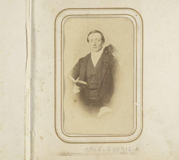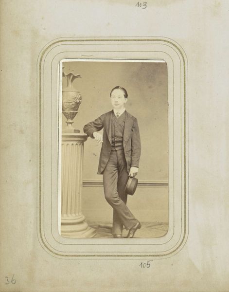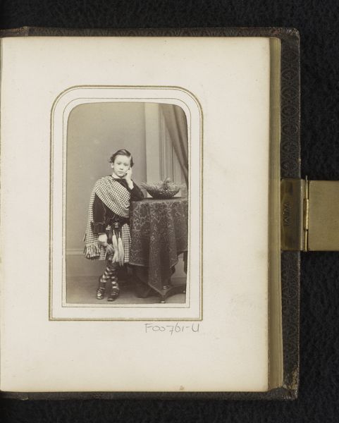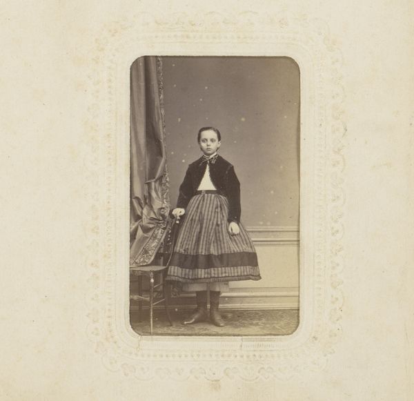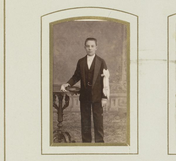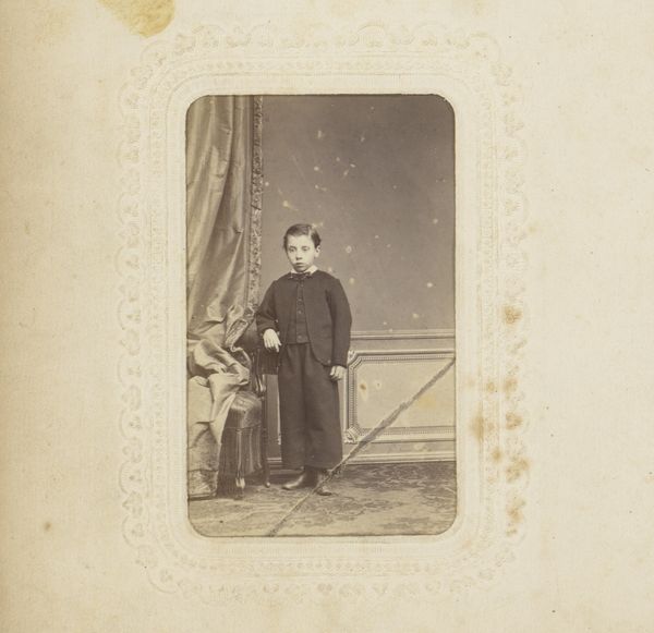 Curator: I’m struck by the stillness of this photograph, the palpable weight of a past moment captured in monochrome. Editor: It has an undeniable formality. We are looking at a gelatin-silver print from somewhere between 1850 and 1900, entitled "Portret van een jongen bij een stoel"—"Portrait of a Boy by a Chair." It's by C. von Boeckmann. The boy’s direct gaze feels quite confrontational, doesn’t it? Curator: It’s more melancholic to my eye, though I agree it makes one consider Victorian notions of childhood. The clothing, slightly too large, emphasizes the child's vulnerability. What symbols might that chair hold for viewers then? Editor: I suspect a prop, mostly. The rigidity of portraiture at that time often resulted in stiff poses, perhaps because of extended exposure times or simply because they were replicating popular tropes of academic art. Though now that you point to it, there is something performative and stagy here. That dark drape, for example. Curator: Absolutely. Notice how the photographer has placed the boy’s hands resting tentatively on the chair back. There’s a tension there between support and restraint. A subtle suggestion, perhaps, that he's posing, yet yearning for freedom. It could point to childhood constraint, class structures, and social expectations for the young boy in that period. The chair could be interpreted to suggest an allusion to tradition and order. Editor: Precisely. And of course, portraiture in general reinforced social hierarchies. To commission such a photograph suggests a certain level of economic privilege, but even then, look at his outfit. The clothing looks basic. The era was an era of burgeoning wealth, but also incredible inequality. Curator: The image embodies a fascinating ambivalence. Is this boy contained or poised for something more? Editor: It also stands in contrast to many of the idealized artistic interpretations from that era. Curator: Right—a moment caught with humanity over hyper-stylized emotion, which brings the era into perspective. Editor: Yes, something very personal and raw coming through—almost resisting all the conventions we are talking about.