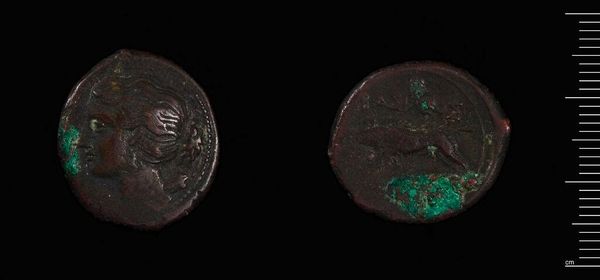 Editor: Here we have a coin, reportedly made by Timoleon, the Tyrant of Syracuse. Look at the wear on the metal. What can we learn from this object about the society that produced it? Curator: The material itself—likely bronze or copper—speaks to resource availability and trade networks. Notice the verdigris, the green patina. Its presence indicates the coin's prolonged interaction with its environment, its journey through time and the earth. Editor: So, the coin’s value lies in its materiality and the labor involved? Curator: Precisely. Consider the process of minting: the mining, the smelting, the die-making, the striking. Each step involved human labor and reflects the social and economic structures of Syracuse. It’s a microhistory of production and consumption. Editor: Fascinating. I hadn't considered the coin as a record of labor. Curator: Thinking about the coin in this way reveals hidden dimensions of history, focusing on the tangible realities of its creation and use. It helps us see beyond the images of rulers and generals. Editor: I see. Thanks for illuminating that.
