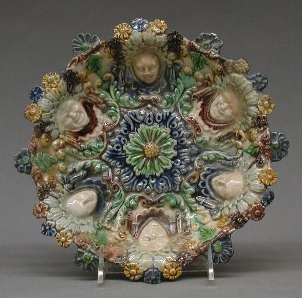 Curator: Take a look at this stunning earthenware piece known simply as "Dish," a creation attributed to Bernard Palissy dating back to the 19th century. It’s currently housed here at The Met. Editor: It's... unexpectedly delicate for a dish! The intricate, almost lace-like structure is so unlike what one expects. It's quite striking visually. Curator: Striking indeed. What interests me most is the process, and its connection to labour and craft. Think of the social conditions in the 19th century and Palissy's workshops, the labor divisions needed to produce such a work. These artisanal ceramics blurred lines between art and industrial practice, opening considerations for craft’s cultural place. Editor: Absolutely, the act of its making carries importance. The overall circular structure and open design work, together producing this intriguing play of negative and positive spaces and also guiding my eyes between various details. Observe, for example, how each facial detail is carefully rendered; a subtle realism with semiotic and ornamental implications that is, well, compelling. Curator: The materiality itself presents fascinating challenges. Bernard Palissy was very influential in using his style within mass production. Do you find a challenge in looking at an item intended for luxury and aristocracy now on display inside the context of a museum for the broader public? Editor: Definitely something to think about. The medium certainly dictated part of its expressive form— the choice of white earthenware against darker colors serves an interesting formal tension; it emphasizes shadows which defines depth to the piece—this chromatic game works harmoniously well. Curator: Indeed. And that leads me to reflect on consumption as well; the "Dish" as a statement on bourgeois identity and how access to artisanal goods can function as an enactment and representation of privilege and taste in 19th century European households. Editor: A compelling perspective. To me, seeing it is simply aesthetically gratifying – an artful arrangement where elements resonate with sophistication regardless if that intention might escape others; such formalistic purity serves its function effectively as the piece simply holds you! Curator: Very well put! This is a stunning item both visually and culturally, and looking into the details is enriching as an experience that considers process and function equally in today's eyes!