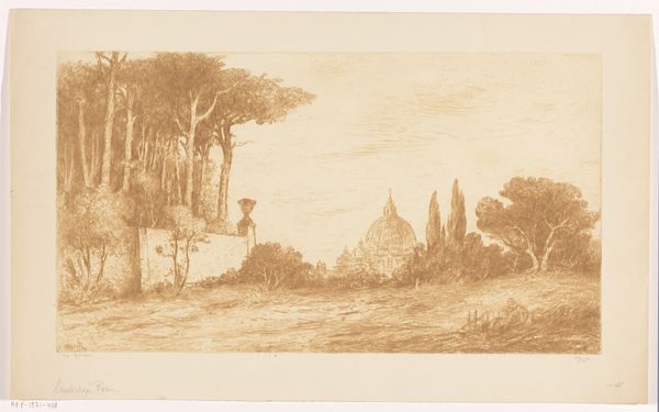 Jens Petersen Lund created this Italian fantasy landscape with trees and houses in the 18th century. The print is defined by its warm, sienna tone and delicate, linear quality. The composition arranges architectural forms and natural elements in a seemingly classical harmony, yet upon closer inspection, the structures appear somewhat ambiguous, more evocative than descriptive. The artist uses line and tone to suggest spatial depth, but the image retains a flatness, disrupting traditional perspective. The repetitive use of hatching creates texture and a sense of atmospheric diffusion, softening the clarity of form. This print challenges fixed meanings. The semiotic interplay between architectural stability and the organic forms of nature reflects a broader intellectual discourse of the period, questioning the boundaries between the ideal and the real. Consider the function of the overall tonal unity; this choice unifies the composition and also acts as a lens, inviting ongoing interpretations of the landscape.