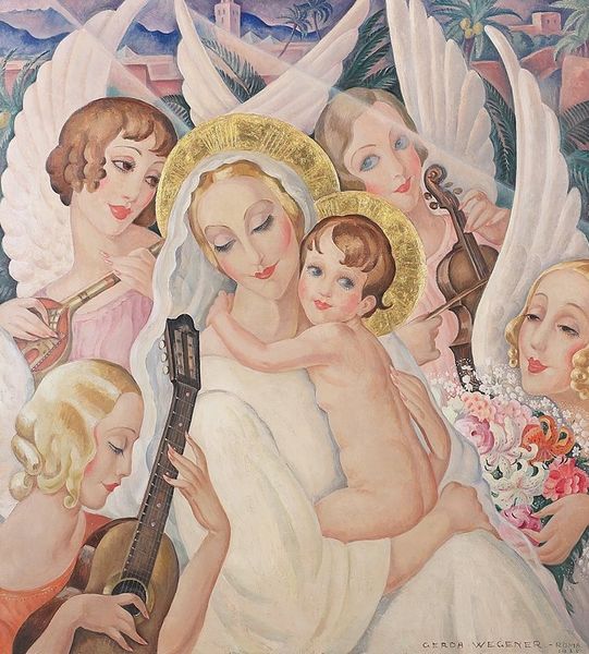 Gerda Wegener painted *A Johan Sebastian Bach Humblement* using oil on canvas sometime in the early 20th century. The painting is arranged into an ascending pyramidal structure with a clear focal point. Five figures are visible, all female, but for the angel wings and halos. Wegener employs a muted color palette, dominated by pale skin tones and soft pastels, which imbue the scene with a dreamlike, ethereal quality. Linear precision is evident in the delineation of forms, from the instruments to the subjects' delicate features. The composition is carefully balanced, with the figures arranged in a harmonious yet dynamic configuration. The artwork invites contemplation on the relationship between tradition and modernity. The semiotic presence of the halos and the association with Bach, a symbol of classical music tradition, suggest an investigation into enduring cultural values, offering a space for reflecting on how these values are reinterpreted in contemporary contexts.