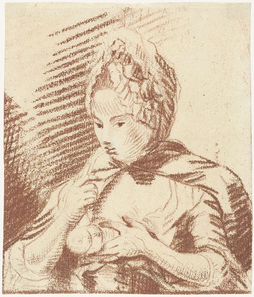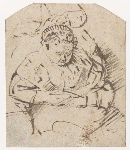 Curator: Take a moment to observe Govert Flinck's double-sided drawing, "A Woman Asleep (recto); Landscape Composition with Well-Sweep (verso)," dating from around 1633 to 1636. It's a Dutch Golden Age piece rendered in pencil on paper. Editor: My immediate impression is one of serene melancholy. The woman's pose seems so burdened, almost collapsing inward. Is it sleep or despair? It's beautifully ambiguous, don't you think? Curator: Absolutely. Flinck masterfully captures the weight of emotion with such minimal means. Look at the soft hatching; the way the lines define form and shadow is deceptively simple. The sleeping nude was a common motif, but Flinck elevates it. Editor: I agree about his artistic mastery with line. The structural economy and semiotic implications here seem endless. He achieves so much affect with so few choices. In some ways, he is on par with one of his teachers Rembrandt Curator: He was definitely very influenced by Rembrandt’s teaching style. While this study might not have been preparatory, such depictions were usually deployed during his time. Think of it, perhaps it would later be placed within a grand history painting. Editor: Ah, true, a springboard for something larger. That reminds us not to isolate our focus, that works, much like ourselves, almost never appear *sui generis*. I will definitely check to see where some of this style appeared in Flinck's historical work later. Curator: This simple image reminds me of all the half-formed ideas swirling about inside us, the feelings we haven't yet fully realized, captured in the guise of simple rest. Editor: I find it quite remarkable that one is often looking at a finished drawing while staring into artistic incubation and possibility. What do you think you would place it inside of if it were up to you?