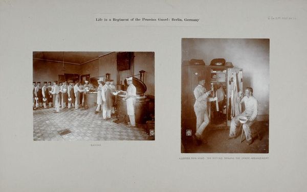Editor: Waldemar Titzenthaler's "War: Germany. Berlin. Prussian Guard Regiment: Life in a Regiment of the Prussian Guard" shows us two scenes, sepia-toned. One is the officers' mess, and the other seems to be the canteen. What symbols stand out to you in these images? Curator: The Prussian Guard represents discipline, order, and the power of the German military, embodying a sense of national pride and perhaps impending conflict. The food preparation hints at the complex logistical system supporting this military machine. Do you see any dissonance? Editor: Well, there's a stark contrast between the officers dining formally and the canteen workers. It highlights class divisions, doesn’t it? Curator: Precisely. This division reflects the social structure of the time, with clear hierarchies symbolized by the uniforms and spaces. The image serves as a cultural memory of the era. Editor: I hadn't considered the uniforms as symbols themselves. Thanks!