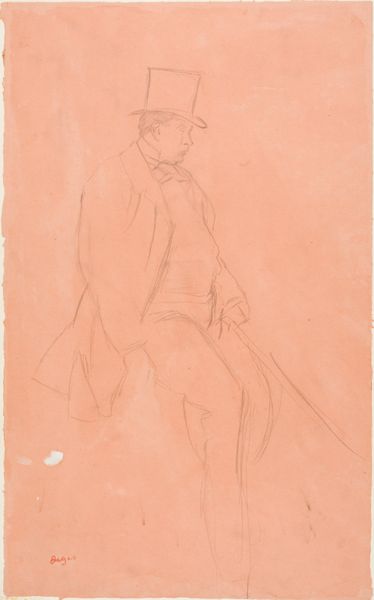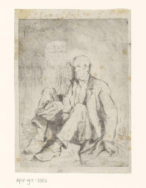 Charles Samuel Keene created this drawing, Seated Man, using graphite. Note the subtle tonality achieved through delicate hatching. The composition is structured by the interplay of light and shadow. Keene destabilizes traditional portraiture through this sketch. Rather than emphasizing individuality, the sitter is rendered with minimal detail. The focus shifts from the subject's identity to the structural elements of the drawing itself. Observe how the vertical lines behind the man contrast with the diagonal strokes forming his figure, creating a sense of depth. The semiotic reading of such contrast emphasizes the precarious nature of constructed social roles. Consider how the visible, raw materiality of the paper support, combined with the sketch-like quality, challenges the notion of a finished artwork. Keene invites us to consider the artwork not as a polished representation but as a dynamic process. This drawing invites us to question fixed meanings and to embrace the complexities inherent in both art and representation.