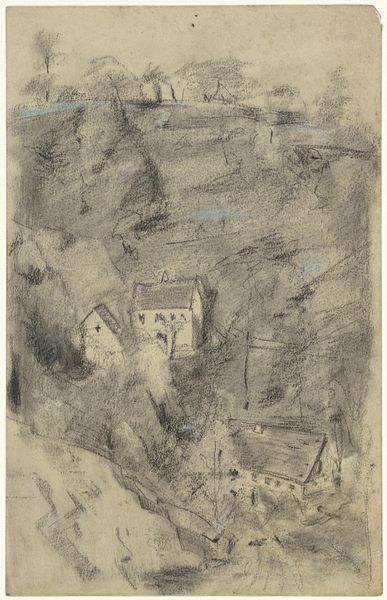 Curator: John Piper's "Kirkmaiden-in-Fernis" presents us with an intriguing ruin rendered in watercolor, ink, and crayon. It's part of the Tate collection. Editor: I'm immediately struck by the tension between the skeletal structure of the building and the encroaching wildness, that green feels almost predatory. Curator: Indeed, Piper frequently explored ruined churches, symbols of history and spirituality fading into the landscape, monuments to a culture’s memory. Editor: And the way he's applied the materials! The layering of watercolor washes and stark crayon lines feels almost like a palimpsest, echoing the physical layers of history within the stones themselves. Curator: The image, almost monochromatic, with sparse color accents, creates a sense of melancholic beauty. What remains becomes precious. Editor: It makes you wonder about the process of its making, the artist's hand enacting its own kind of destruction and reconstruction through material application. It's not just representation; it’s almost a parallel act of building and unbuilding. Curator: Piper's architectural subjects often carry a profound sense of the sublime, the beauty found in the face of decay and the power of the past. Editor: It leaves me contemplating the labour embedded, not only in the art's creation, but also in the original building, both now subjected to the relentless march of time.