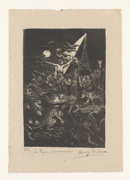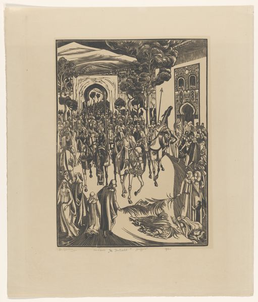 Curator: Before us we have Ernst Ludwig Kirchner's "Ansprachen auf der Strasse II," or "Street Scene II," an etching dating back to 1914. It’s currently held in the Städel Museum. Editor: What immediately strikes me is the stark, almost brutal quality of the lines. There's a palpable anxiety conveyed through the figures and their claustrophobic proximity to one another. It almost feels like we're observing a collective neurosis. Curator: Indeed. Kirchner's involvement with the Die Brücke movement heavily influenced his portrayal of urban life. There was a societal apprehension at the time towards burgeoning urban life and societal ills. We must note his representation of modern life reflected a critical engagement with societal norms. Editor: Absolutely, and it’s visible in the figures themselves. Notice the hats and formal attire; those visual elements communicate class and decorum, which is contrasted so boldly by the artist's stylistic rendering. I think this illustrates his critical commentary on societal conventions, almost making them seem like suffocating masks. Curator: These sharp lines and truncated forms are visual indicators of Expressionism. It demonstrates an interest in revealing psychological and emotional realities that lie underneath polite social life, and certainly speaks to broader anxiety present in Germany just before the Great War. The subject also offers historical perspective; public gatherings and discourse are illustrated here as a spectacle. Editor: Right. Looking closer, even the presence of the dog becomes meaningful; in Western art, dogs are symbols of loyalty, but this animal appears more as a wraith-like presence than as a steadfast companion, reflecting how values have deteriorated, and emphasizing the impermanence of social structures. I think Kirchner succeeds in visually destabilizing these concepts, leaving them as wisps of their former cultural association. Curator: And thinking about this work within the wider scope of Kirchner’s career, the image reiterates similar tensions in other graphic works and paintings; however, it’s distinct qualities also makes this etching especially crucial for examining cultural change occurring around this time. Editor: It’s an impactful piece, to be sure. The way the seemingly simple marks and figures assemble to trigger deep unrest makes the image an exemplar of this time and stylistic period. Curator: Absolutely. Considering it within Kirchner's entire career as well as contemporary themes underscores the work’s significance. Editor: It will linger in the mind, I'm sure. A striking window into both the artist's mind, and the anxieties of a society hurtling toward war.