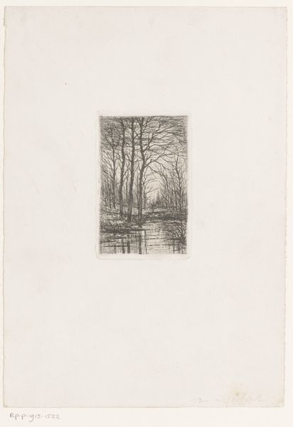 Curator: This is "Bomen langs een vaart," or "Trees Along a Canal," a pencil drawing created in 1887 by Richard Nicolaüs Roland Holst, housed right here at the Rijksmuseum. Editor: It’s interesting; I am immediately drawn to the texture, a certain softness conveyed by the pencil work. It evokes a melancholy mood, like a quiet observation on a gray day. Curator: Absolutely. And Holst was deeply engaged with socialist ideals; his artistic practice was very rooted in challenging the status quo. This almost mundane landscape can be interpreted as a reflection of the everyday lives of working-class people, elevating their ordinary environment. Editor: I see that now. The repetition of the trees, the mirrored images in the water—there’s something almost factory-like in their formation. It definitely raises questions about how industrial labor impacts our relationship to the natural world. Do you think Holst was aware of the looming climate challenges even then? Curator: It’s difficult to say if Holst envisioned the full extent of today’s environmental crisis, but it is undeniable that this image captures a pivotal moment. It subtly critiques industrial expansion and its transformation of the natural world, hinting at an anxiety that we can definitely understand through a contemporary lens. This anxiety speaks to broader societal anxieties of class, production, and environmental awareness in art during this time. Editor: Right. And thinking about the process – this being a pencil drawing – is crucial. Pencil allows for subtlety and iteration, which connects the artist to the labor inherent to creating the scene in the work itself, mirroring labor practices from that time. Curator: Exactly, and by choosing such a "common" subject—trees along a canal—Holst encourages us to consider the beauty and importance of overlooked places and the people who inhabit them, disrupting the conventional artistic narratives centered on grand historical events or portraits of the elite. Editor: Well, I’ll certainly view canal-side trees with more thought now, thinking about Holst’s choice of pencil and this depiction of commonplace subject matter, as the materialist artist’s tool and topic for engaging a sense of ordinary dignity. Curator: I agree; situating this work in the nexus of labor movements and early environmentalism really unlocks new interpretations. It becomes not just a pretty sketch, but a quiet protest.