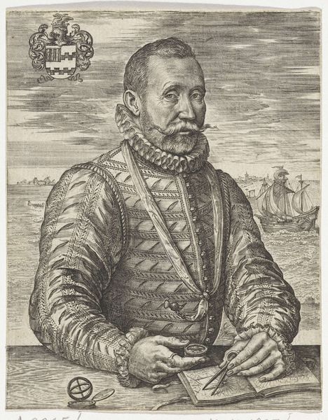 This is Hieronymus Wierix’s, "Portret van een man met een vaandel", made around the late 16th to early 17th century. The portrait, rendered in engraving, presents a man in formal attire, framed against a subtly textured background. The meticulous detail in the ruff collar and patterned sleeves suggests a focus on status and identity. Consider how Wierix has structured this image. The composition, while seemingly straightforward, engages with the semiotic language of portraiture at the time. The inclusion of a banner, partially visible, hints at civic or military affiliations, codes that would have been readily understood by its contemporary audience. Note how Wierix uses line and texture to differentiate between the man's face and clothing, and the more abstract rendering of the background, suggesting a hierarchy of importance. The formal elements here—the precision of line, the contrast of textures—invite us to contemplate the layers of meaning embedded in the image. It’s a study in how art reflects and shapes cultural values.