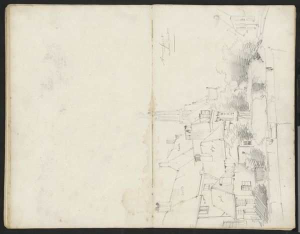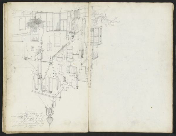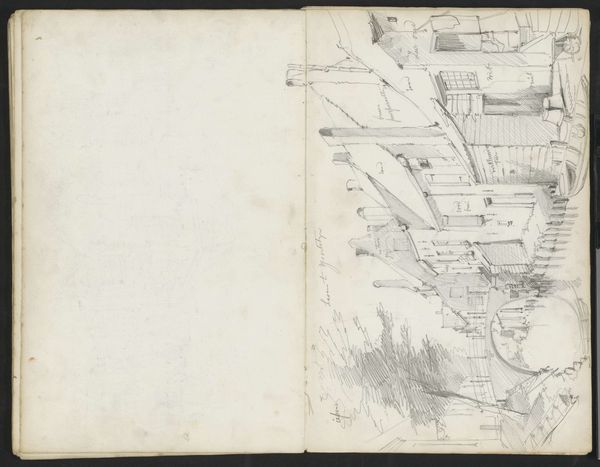 Willem Koekkoek sketched the Grote Kerk te Vianen in graphite, using lines to capture its form. The artist, choosing a sketchbook over canvas, signals a departure from traditional fine art. The sketch is made with graphite, a readily available material in the 19th century, and a tool associated with preliminary work rather than finished pieces. The use of line work emphasizes the structure of the church, and the artist captured details such as the gothic windows and roof tiles. The sketchbook format invites viewers to appreciate the immediacy of the artist's hand and thought process, revealing the labor involved in translating a three-dimensional structure into a two-dimensional drawing. By focusing on materials and processes, we appreciate the ways in which the artist broke away from convention, challenging the divide between fine art and craft.
