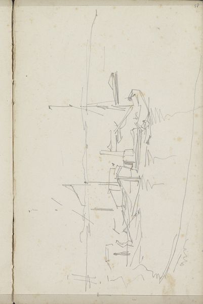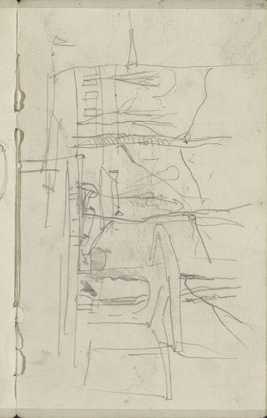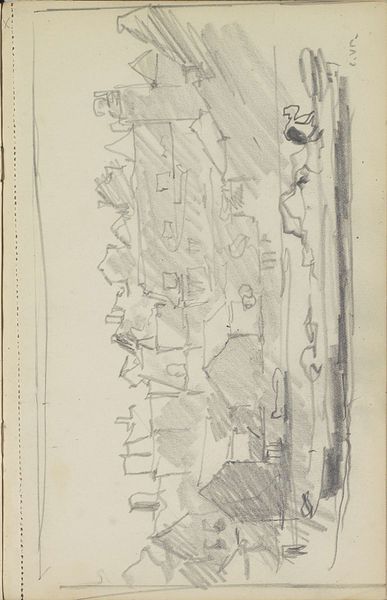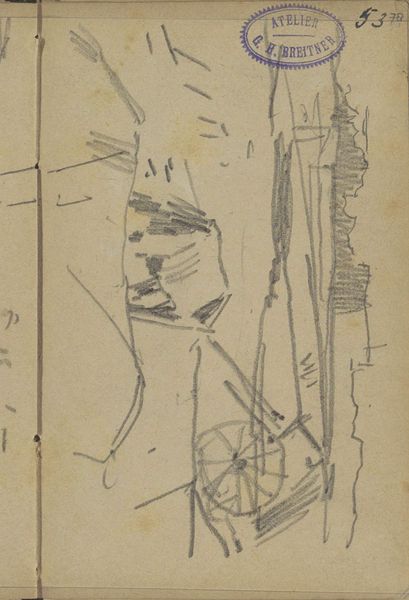 Editor: This is "Vrouw in een steeg," or "Woman in an Alley," a pencil drawing by George Hendrik Breitner, likely made between 1887 and 1891. It’s currently held at the Rijksmuseum. The sketchiness and tonal range of the pencil against the paper creates an almost dreamlike impression. How do you interpret the composition and the techniques Breitner used here? Curator: Well, observe how the artist uses line to delineate form and space. The varying weights of the pencil strokes create depth, pushing back into the recess of the alley, whilst the subject is captured in simplified form with almost geometrical precision. Editor: Geometrical precision? That’s interesting. To me, the sketch appears more organic and gestural. Curator: Note the structural framework of the composition, the way the vertical lines define the buildings, the posture of the figure... The linear framework seems intended to create a structure that contains all the elements depicted in a rigorous geometrical way. Do you not find this interesting? Editor: I see what you mean. It does add a certain…stiffness…despite the apparent spontaneity. Are the darker shades serving to contrast this? Curator: Precisely. This textural counterpoint serves to activate the surface and to energize the structure in terms of contrast. Now, let’s look more carefully at how this generates interest by creating visual planes. How does that shift your perception of his strategy? Editor: Seeing that play between structure and texture, I think it brings some much needed life into the piece. Breitner's really directing the viewer’s eye here. Thank you for clarifying that. Curator: A keen eye notices these relationships, where the geometrical and the spontaneous support the entire vision of the artist.