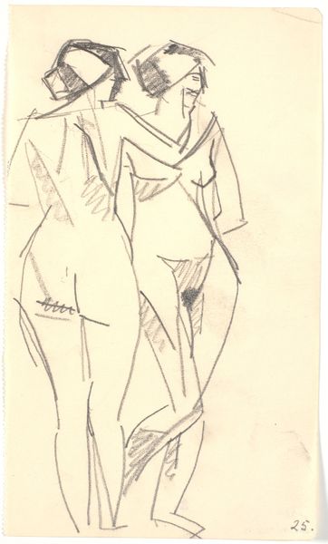 Editor: This is "To stående modeller" by Karl Isakson, made between 1914 and 1915. It's a graphite drawing of two nude figures. The lines are so simple, almost abstract. It gives off a feeling of vulnerability, but also a sort of defiant modernism. What do you see in this piece? Curator: That sense of vulnerability amidst defiant modernism really captures the socio-political atmosphere of the time. Consider that this was drawn during the period just before and into World War I. The nude figures become more than just representations of the body; they reflect societal anxieties. Editor: How so? Curator: Well, look at the expressive lines, a hallmark of expressionism. Expressionism emerged partly as a reaction against industrialization and growing urban societies. The raw emotion conveyed in the lines—the intentional distortions of form—reflect a deeper unease. This was a period grappling with new social norms. How might exhibiting nudes like these challenge the conventional and promote a radical shift in cultural expression? Editor: I see your point. The nudity isn't just about the figures themselves, but a statement against a more buttoned-up society? Like, a pushing back against older, established academic traditions? Curator: Precisely! Art institutions played a huge role in shaping and mediating those conversations. Imagine the act of displaying these pieces in a gallery – it becomes a space to question those traditional values, a political act through visual representation. The public viewing experience would undoubtedly invite strong reactions and contribute to the debates about the role of art in a changing world. Editor: I never thought about it that way, seeing it as more of a commentary on social norms rather than just figures in a room. Curator: Indeed. That’s often the role of art in times of societal shifts, holding up a mirror and challenging established views. It provides critical visual vocabulary through which anxieties are revealed and perhaps addressed.