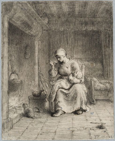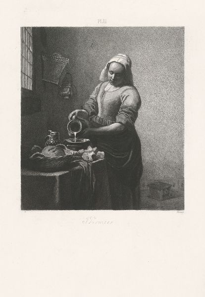 Editor: So here we have "A Woman Peeling Pears," likely created between 1635 and 1677, by Wallerant Vaillant. It's a print, and I am struck by the stillness of the woman amid the surrounding objects. It is mostly charcoal with only slight variations in shade. What's your take on this piece? Curator: It is interesting how Vaillant uses tonal gradations to achieve such a nuanced composition. Note the subtle variations in texture - from the smooth skin of the pears to the rough wood of the background. How do these material contrasts shape our reading of the scene? Editor: I see how those contrasting textures highlight the ordinary, everyday nature of the scene. But I hadn't really thought about the relationship of the tones. Does that contribute to the artwork? Curator: Precisely. Observe how the composition, employing subtle lighting, directs the viewer's gaze toward the figure of the woman. And notice the objects arranged almost in parallel with her - how is the gaze reflected? What does the structure achieve? Editor: It definitely gives a sense of the domestic. The tonal harmony creates a very intimate mood too, drawing us into the scene despite the fact that it's in simple blacks and whites and grays. Curator: Yes, consider how the formal elements—line, tone, and texture— work together. Vaillant doesn't create an illusion but renders everyday activity of shape and form. Do you agree? Editor: Yes, definitely. I'm also interested in how Vaillant uses printmaking, which makes this art accessible to a larger audience. That fact is a fascinating formal element itself. Curator: Excellent point. That insight underscores the intricate relationship between the formal properties of the work and its historical significance. Editor: This was incredibly insightful, thank you! It definitely enhanced my understanding of this artwork and shifted how I view prints overall. Curator: My pleasure! Looking closely, that’s where art reveals itself.