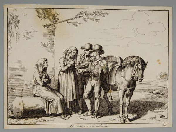Editor: This etching, "Costumes from Rocca di Papa" by Bartolomeo Pinelli, depicts a family with a dog traveling on foot. It has a certain rustic charm. What significance do you think these figures and their attire might hold? Curator: Notice how the woman carries the child in a basket on her head. It's a powerful visual metaphor, isn't it? The weight of the future, literally and figuratively, rests upon her. Observe the man's staff, almost a shepherd's crook, representing guidance. Editor: So, you see these everyday items elevated to symbols? Curator: Exactly. Pinelli captures not just costumes, but a narrative of family, labor, and societal roles. It's about the shared burdens and hopes, expressed through familiar imagery. Do you see a visual parallel between the dog and the man? Editor: I do now. They both walk with a sense of purpose. It enriches my understanding. Curator: Indeed, Pinelli reveals how even simple scenes carry layers of cultural memory.