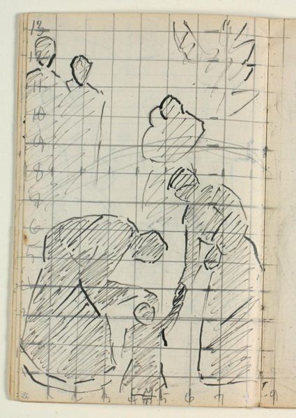 Curator: Niels Larsen Stevns created this sketch, “Udkast til "Kristus velsigner de små børn",” sometime between 1937 and 1938. It’s a drawing done with pen on toned paper. Editor: It looks like a page ripped right out of somebody's diary, or better yet, a storyboard—hints of a bigger story with simple but evocative pen strokes. You can almost hear the scribbling. Curator: Precisely. What strikes me most is the dynamism achieved through such rudimentary means. The composition, though fragmented, uses line and form to convey movement and emotional resonance. Editor: Absolutely. There's something incredibly immediate and raw about it, especially that main scene. I see it: a figure – presumed to be Christ – bending over children with one raising an arm as if they have an answer in school. Very intimate, vulnerable moment. Curator: Notice the subtle application of cross-hatching, particularly in rendering the garments of the figures. This not only adds depth but also suggests a certain gravitas appropriate to the subject matter. It also reveals the structure of those figures... Almost geometrical. Editor: See that child's outstretched arm and you almost want to grab it! Despite how preliminary the art is, it’s that kinetic gesture, that moment that encapsulates an act of simple blessing and instruction. Do you feel that urgency, a need to bless or connect before time runs out? Curator: Urgency, yes, is definitely an important component here. But more, I perceive it as part of an inherent exploration of theological themes as he experiments with visualizing narratives through basic sketches. It’s more about deconstructing an image of blessing rather than performing it... Editor: I still can't help seeing his own story interwoven... But maybe we're both reading into his strokes here. Ultimately, this tiny storyboard frame feels vast, like it's yearning for something much larger... Curator: Indeed. The work leaves us considering the powerful visual and symbolic language artists utilize even at the genesis of a larger work.