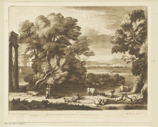 Curator: What a serene scene. We’re looking at “Landscape with two cities on hills and cattle drivers crossing the river,” dating possibly from 1775 to 1779. The piece, currently held at the Rijksmuseum, is an engraving by Richard Earlom. Editor: My initial feeling is that of looking into a dream, like a fond, idealized memory. The sepia tones give it such a lovely, aged quality. Curator: Indeed. Earlom wasn't creating an original composition here, but rather reproducing a drawing by Claude Lorrain. It’s fascinating to observe how the romantic era looked back to and reinterpreted classical pastoral ideals. Notice the tiny figures leading the cattle – the image of simple folk. The cities on the hill are symbols of civilization and human settlement. This blend creates an Arcadian fantasy—an earthly paradise. Editor: Right, that makes perfect sense! The city, far away and smallish in size, really underscores that "humanity in harmony with nature" thing. But there's also something about that low horizon line, giving prominence to the sky... almost feels like the natural world is grander than anything humanity could build. What do you reckon? Curator: I think you've hit on something significant. The atmospheric perspective reinforces that sense of vastness and insignificance in the face of nature's grandeur. Romanticism certainly emphasized that awe and sublime beauty. And this ties into a tradition of landscape as spiritual refuge. People could gaze upon this vista, be transported elsewhere, and perhaps consider something transcendental. Editor: It's so interesting how an image originally meant to represent peace and a simple life can evolve over time and reflect different sensibilities. Now it's also an image *about* the artistic and spiritual ideas of an era. A sort of reflection looking into a reflection. Curator: Exactly. The layered interpretations are part of what make art so compelling. What seemed important to Earlom may be totally different from what we see in the print now, or what Lorrain, whose drawing he was copying, was after originally. But, it all lives in this single image now. Editor: So, as viewers today, we're looking at not just a peaceful countryside, but the history of seeing a peaceful countryside! Lovely thought to end on.