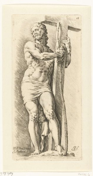 Curator: This is Jan Swart's "Hercules", created sometime between 1779 and 1794, rendered in charcoal and pencil. A preparatory drawing perhaps? It's interesting to see a Romantic interpretation of this classical figure. Editor: My first impression is power and vulnerability existing simultaneously. Look at the stark nudity, but he’s also got this slightly agonized expression, like carrying the weight of the world – or at least, a really heavy club and a very dead lion – is actually getting to him. There’s such drama in this quiet moment, wouldn't you agree? Curator: Absolutely. The social context of its creation interests me—the late 18th century saw a revival of interest in classical ideals. Swart used accessible materials, focusing on draftsmanship as a core skill, imbuing a classical subject with new expressiveness. The choice of drawing—specifically, pencil and charcoal—suggests both the accessibility of artistic training, and also how even simple materials can express monumentality. Editor: He seems so weighted, bowed by…something, perhaps more than just that giant club he's lugging around. The Lion’s skin is almost… decadent! Considering the implied violence, is it possible to feel empathetic, complicit almost, in Hercules’ heroism. It makes one wonder what myths we fashion and adorn in our own age, doesn't it? The texture he achieved, like smoky velvet... Curator: I agree it transcends a mere classical depiction. It is a dialogue between antiquity and Romantic sensibilities. By depicting Hercules nude and armed, Swart seems to suggest he exists both as this immortal archetype of power, and yet as vulnerable human exposed. There’s a stark vulnerability in his physical presentation. Editor: It makes me consider how we use these foundational stories and icons. I guess everyone relates to Hercules – we are all so fallible! And yes, you are right. I was drawn into that material reality, how the texture of the charcoal almost dissolves and forms. Wonderful tension. Curator: This is what I find so enduring and rich in his depiction; it transcends both his technical craft and period; it allows us to think about it with new eyes. Editor: Right. A powerful figure and rendering! Thanks for bringing the labor to life and illuminating the journey, material and spiritual.