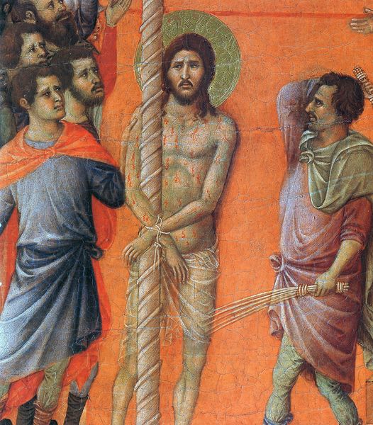 Duccio painted this fragment of 'Christ on the road to Emmaus' with tempera on wood. Notice how the composition draws your eye in with its use of colour and the arrangement of figures. The painting is bisected, the cool blues and greens on one side offset by the warm oranges and reds on the other. This division creates a visual tension which invites closer inspection. The figures are set against a gold background, a common feature in medieval art, which flattens the space and emphasizes the symbolic nature of the scene over realism. Duccio uses line and gesture to convey the story's emotional depth. The figures' faces, though stylized, communicate curiosity and engagement. The folds in their garments add depth. The interplay of color, line, and form here isn't just decorative; they're integral to the painting's expression of faith and human understanding. The artwork offers a glimpse into a world where the sacred and the human intersect, inviting us to consider the complex interplay between form and meaning in art.
