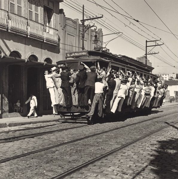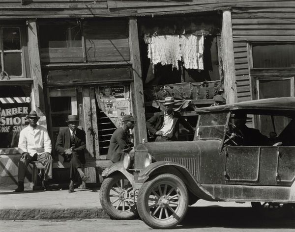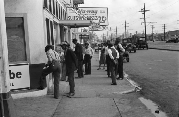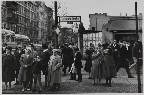 Curator: This photograph by Dorothea Lange, taken in 1942, captures a stark scene in San Francisco, California. It's titled "Residents, of Japanese ancestry, appearing at the Civil control station for registration in response to the Army's exclusion order No. 20." Editor: My initial reaction is one of profound stillness despite the palpable tension. The greyscale lends a historical distance, yet the queue feels unending, ominous. Curator: Precisely. The photograph’s formal composition contributes to that feeling. Lange positions the viewer high, looking down upon a line of people, mostly men, snaking down the street. The repetition of figures, framed by the architecture, creates a visual rhythm. Editor: Symbolically, the line is the heart of it, isn’t it? Lines are borders. This visual representation of waiting implies the surrender of autonomy, of personhood. They stand in the shadow of ornate American architecture, representing inclusion for some and exclusion for others. Curator: Note the tonal range. The dark suits contrast sharply with the white building façade. It accentuates the density of the group while directing our gaze to the implied entrance where people enter as private citizens, but will soon leave as part of a processed demographic. Editor: The gaze is very interesting here, particularly in those nearest the camera. Few meet Lange's lens. Most stare forward. They betray a potent mixture of fear and forced compliance. Curator: Absolutely, and that compliance speaks volumes about the psychological power structures at play. Lange worked for the War Relocation Authority, and later released photos that she knew wouldn't be used precisely because they depicted the unjust nature of the internment. Editor: And that single soldier present at the entrance. His uniform silently attests to authority. The repetition of hats suggests an attempt to diminish the individuals, who collectively embody a cultural identity reduced to its racial origin. It strips people of their histories and replaces them with statistics. Curator: The photograph then functions on multiple levels. Formally, it is a study of line, tone, and composition. Yet, its symbolic power resides in its ability to convey the human cost of racial prejudice during a dark period in American history. Editor: Reflecting on it now, Lange masterfully captured how visual rhetoric could turn prejudice into tangible policy, all in one patiently enduring, snaking line. Curator: Indeed. The photograph is an examination of social organization but even more importantly, of what that organization truly implies for individuals in an unsettled and hostile world.