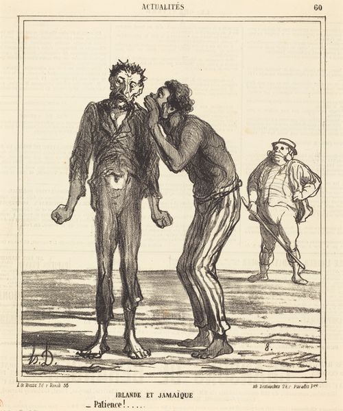 Curator: The piece before you is titled "Les chasses ... ne se ressemblent pas," dating back to the 19th century, created by Honoré Daumier. It's a lithograph, a type of print. Editor: My immediate impression is a strange blend of humor and social commentary. The figures feel grotesque yet familiar, like distorted reflections of society's elite. Curator: Indeed. Daumier was known for his satirical caricatures that skewered the bourgeoisie and political figures of his time. Considering its title translates to "Hunts...are never alike", how do you interpret the symbolic value? Editor: Well, hunting traditionally signifies power and privilege. Yet here, the figures are absurd. One's clad in antiquated hunting attire, recalling aristocratic traditions, while the other appears as a disheveled everyman with a modern rifle. It signifies how social classes are divided with power disparity. Curator: Precisely. His work highlights the shifting power dynamics, contrasting the old aristocracy with the rising middle class and suggesting that the 'hunt' or pursuit of success and status, plays out differently depending on your place in society. This connects with the French Revolution ideals of equal society, a far cry from the reality of the 19th century France. Editor: Also notice how Daumier's drawing style impacts the overall message. The heavy lines exaggerate their features into caricature, heightening the satirical edge, evoking disdain and laughter in equal measure. Curator: It really embodies the core of what realism strives for, an honest if unflattering, depiction of life and, importantly, power. Daumier held a mirror up to French society so his contemporaries were confronted with what was hiding in plain sight. Editor: Absolutely, this print's strength lies in its ability to connect the social landscape of the time with timeless symbols. Daumier exposes universal struggles through hunting. It forces you to wonder, does everyone even have the chance to 'hunt'? Curator: Food for thought, truly. Considering its artistic merits and social critiques, Daumier's print reveals that some hunts, in life and art, are indeed never alike.