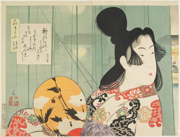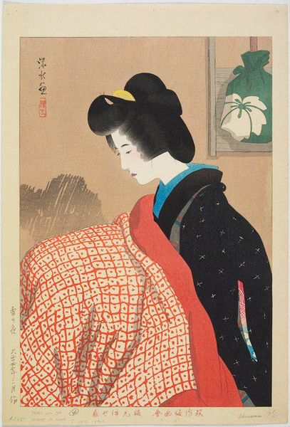 Editor: Here we have Ito Shinsui's "Gifu Paper Lantern," created around 1930. It's a beautiful woodblock print, and I find its gentle colours so captivating. What draws your eye when you look at this, considering its ukiyo-e context? Curator: The way the artist has used the lantern, both as a light source and almost as a second face reflecting off of hers, that is so interesting! It invites the viewer to reflect, not just on the woman in the print, but also on our own perceptions. Don't you find it mirrors how we often search for enlightenment? Editor: Absolutely, I can see that. It is evocative. What do you think about her almost mournful gaze and her posture? Curator: Exactly. Her posture, almost caught mid-motion, maybe it's about transience... like a beautiful, fragile memory. We can nearly feel the humid air of a summer evening, can't we? Maybe she is dreaming of her sweetheart in an Orientalist narrative? I like how we feel part of a silent story... a whisper that feels incomplete to begin with, inviting our own emotional connections to make it whole. What does she say to you? Editor: That’s a beautiful observation. I like how you put it! Maybe she reminds me a little of someone I once knew? It seems to tap into nostalgia for an unknowable past. Thank you for sharing that perspective; it gives me a fresh insight to ponder! Curator: Oh, and isn't that how art becomes something alive in our lives? Wonderful!