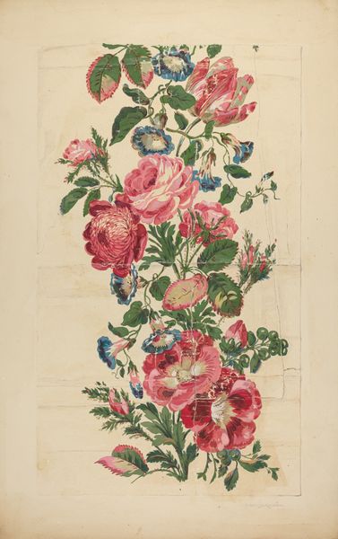 Curator: Looking at this piece, it evokes for me a very comforting domesticity. Editor: It absolutely does. I am drawn to this work for its palpable sense of handmade charm. The “Hooked Rug,” dating back to about 1936, by Ruth M. Barnes, uses a mix of media and textile to create, as you said, Curator, something almost maternal. It feels like a cherished object that one might find in a cozy cottage or farmhouse. Curator: Precisely. Rug hooking itself has deep roots in resourcefulness. Traditionally, women repurposed scraps of fabric, giving humble materials a new, beautiful, and functional life. Consider the cultural memory embedded in those fibers. Each snippet might carry a story, a memento of clothes worn, or remnants of a loved one’s belongings. Editor: Yes, I'm particularly struck by the kind of joyous naivety of the floral arrangement. It is bursting with vibrant reds, blues, and pinks against this, as you mentioned, resourceful background. I love the tension there. The composition is dense, almost overflowing, creating an atmosphere of abundance, maybe even folksy optimism? Curator: I appreciate your observation regarding its density. Folk art, generally speaking, is rarely minimalist, wouldn't you agree? In many traditions, abundance symbolizes prosperity and good fortune, as if warding off potential want. It taps into that part of the collective unconscious. The symbol-making apparatus just doesn't quit. Editor: The brown background acts like a stage; it simultaneously anchors the piece and lets the colors pop, in the purest definition of Regionalism and Naive Art. Did anyone try to do that in fine art in those days? It speaks to the democratization of creativity – everyone has something beautiful to offer from their experience and their surroundings. Curator: Exactly! That is the enduring allure of this piece. In contrast to abstract art movements brewing elsewhere at the time, regionalist work centers upon the intimate and identifiable as both its means and subject. It tells the quiet but insistent stories of the ordinary people whose symbols form its visual vocabulary. Editor: Thanks for pointing that out, Curator. Looking at this Hooked Rug again, it's not just decorative; it’s a portal. It links us back to the hands that created it and, I think, a shared human impulse to make, and to make beautifully. Curator: And to cherish the everyday. The stories interwoven within these textiles provide enduring warmth.