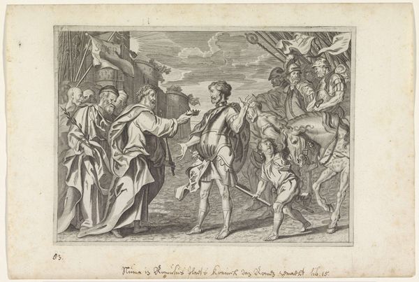 Editor: This is "Baptism of Christ" from 1626, an engraving by Francesco Villamena. It's an image just brimming with Baroque drama and religious symbolism. I’m really struck by the contrast between the ethereal, almost swirling figures of the angels and the more grounded, almost stoic poses of those being baptized. What really stands out to you? Curator: The beauty is that the Baroque *always* seeks the drama, doesn’t it? To look into Villamena's work, here, is to look into the *feeling* of devotion and sacrifice rather than, say, a more literal record. See how the light itself seems to emanate from Christ? I think what captivates me the most is its very ethereal, floating quality… like a story half-remembered, almost a dream. Are you drawn to that use of light and shadow as well? Editor: Definitely! It's almost like a spotlight effect drawing my eye to the crucial figures. But do you think there's a tension, then, between that dreamlike quality you mention and the sharp, almost clinical lines of the engraving? Curator: It's a tension certainly, that reminds us that even within moments of great emotion, craft endures. And engravings, for their seeming rigidity, could capture remarkable detail. Look closely: that texture! That interplay of light… Is that stillness not an echo chamber for feelings so deep they silence the world around them? I get utterly transported…it feels very human, doesn’t it? Editor: That's such a wonderful point! I was so focused on the dramatic elements I didn't fully appreciate the subtle, more personal aspects. Curator: Art is so good for this kind of dialogue. The feeling of getting something wrong and the permission to go from there. Editor: Yes, indeed. Thanks for guiding me to discover this fascinating perspective!