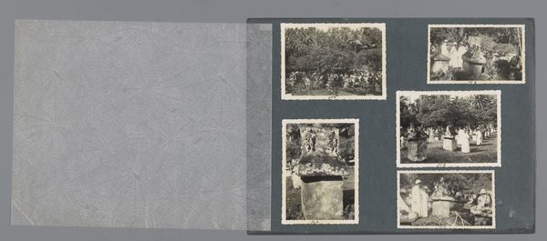 This is a page from the Wachenheimer family album, created around 1932 in Stuttgart, Germany. It's a fascinating arrangement of black and white photographs set against a patterned backdrop. The composition immediately strikes you with its geometric interplay. A square photograph of pigs is placed above a horizontal sequence of Stuttgart cityscapes, each framed with decorative borders. The contrast between the organic subject matter of the pigs and the rigid, architectural lines of the city creates a visual tension. Consider how the Wachenheimer family used the album page to construct their own narrative. The juxtaposition of the intimate, rural scene with the urban landscape hints at broader themes of place, identity, and memory. The album is not just a collection of images, but a carefully constructed document reflecting personal and cultural experiences during a transformative period. It invites us to reflect on how we organize and interpret visual information to create meaning.