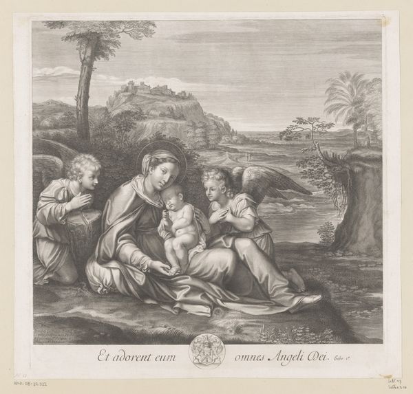 Curator: This is François de Poilly the Elder’s engraving, "Virgin and Child Adored by Two Angels," housed right here at the Harvard Art Museums. Editor: There's a striking intimacy in this image, almost familial, despite the divine subject matter. Curator: Indeed. Poilly's mastery of line and tonal variation creates a captivating composition. Note the pyramidal structure, stabilizing the figures within the landscape. Editor: I'm struck by how the virgin, seemingly the same age as the adoring angels, presents a youthful and perhaps more approachable vision of motherhood. Curator: The landscape itself, though secondary, is meticulously rendered, adding depth and a sense of idealized serenity. Editor: I appreciate how Poilly subtly challenges traditional representations, inviting viewers to consider new perspectives on feminine strength and divine grace. Curator: A beautiful piece—one that speaks to the power of form and composition. Editor: Yes, and how those elements can still inspire contemporary dialogue around identity and representation.