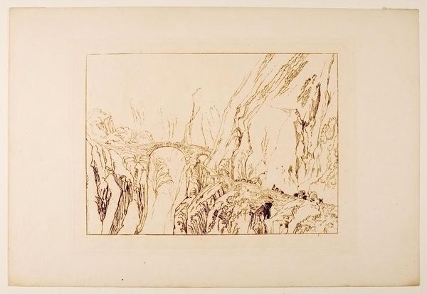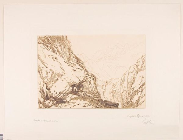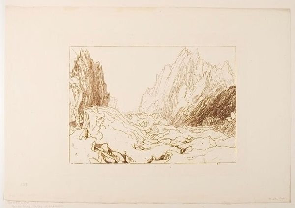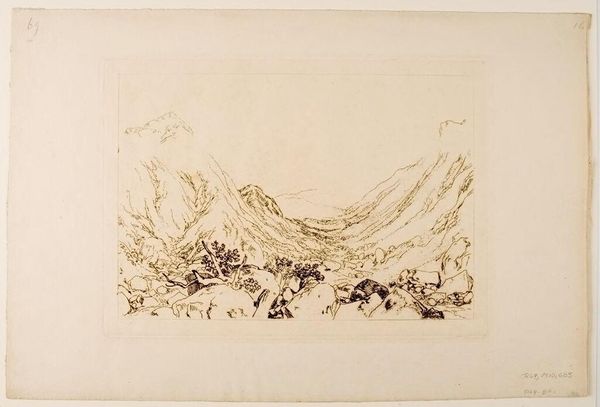 Editor: So, this is "Ben Arthur" by J.M.W. Turner. It's an etching, quite small, and it feels… unfinished, almost like a sketch. What strikes you most about it? Curator: It's interesting you say that. Turner was deeply engaged with the social perception of landscape. The "unfinished" quality could be a deliberate commentary on man's fleeting impact on nature, contrasting with the imposing permanence of mountains like Ben Arthur. Editor: So, it’s about the relationship between humans and nature? Curator: Precisely. Consider the historical context: the rise of industrialization and urbanization. How do you think an image like this would be received amidst such rapid change? Editor: I guess it would remind people of what they were losing… that’s insightful. Curator: Indeed, and Turner, through his art, contributed to shaping the cultural value we place on untouched landscapes.