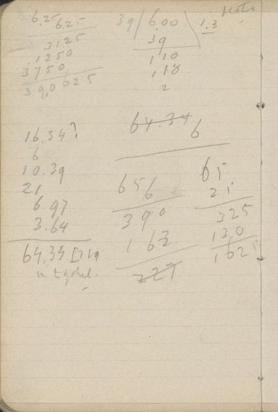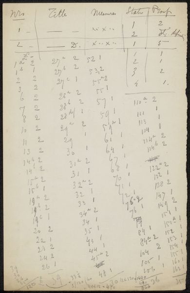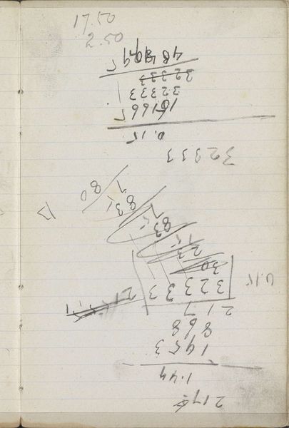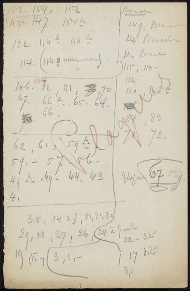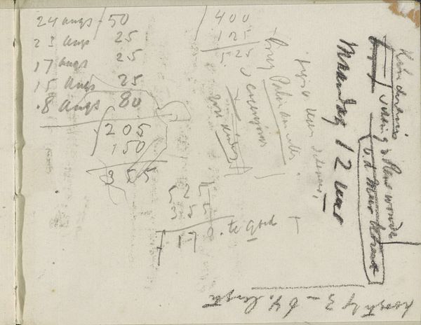 Curator: This is a page from a sketchbook by George Hendrik Breitner, dating back to 1893. It’s titled "Annotaties" and is a fascinating peek into his process, rendered in ink on paper. It resides here at the Rijksmuseum. Editor: My first impression? Utter chaos! It looks like someone spilled numbers and notes all over aged paper. I see a few sums maybe? What on Earth could all this be? Curator: Well, let's analyze its form. The eye is immediately drawn to the seemingly random placement of figures and hastily scribbled text. There's a distinct lack of hierarchy; the composition resists any clear focal point. It's the artistic process, unfiltered, laid bare. Editor: That's generous. Breitner was working in Amsterdam in the late 19th century when rapid urbanization and industrialization were radically altering society. What role do sketchbooks play during this period in the face of such disruption? Does this offer Breitner’s immediate and subjective reactions to these changes? Curator: Precisely. Notice the tonal range, varying from very dark, decisive marks to lighter, almost ghostly impressions. The materiality of the aged paper is itself significant— it provides an interesting contrast to the ephemeral nature of what I imagine might be bookkeeping annotations. Editor: I can see the appeal, it represents a particular time when account keeping transitioned from purely manual ledgers into early adding machines! How do you see this in relation to his broader artistic output? This feels a world away from his more polished, recognized works, almost oppositional in spirit, in the artistic process. Curator: It contrasts and compliments them. His street scenes are well known; those artworks showcase careful selection and crafting. The annotations displayed here offers something unfiltered. I read a particular energy of its pure design. Editor: So in essence, "Annotaties" grants us permission to be a witness to his stream of thought. What seems unstructured becomes a study in a master’s craft. Thanks for that insight. Curator: My pleasure, these artistic puzzles do offer exciting interpretations into the minds of these individuals.