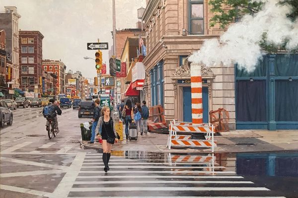 Editor: So, here we have Vincent Giarrano’s painting, "The Corner of Grand and Mott." Painted *en plein air*, it really captures a slice of city life. The detail in the shopfront is captivating, but what strikes me most is how everyday and unglamorous it feels. It's not a postcard view. What do you see in this piece? Curator: Ah, yes! Unglamorous, perhaps, but brimming with a different kind of beauty, don't you think? It's a symphony of the mundane, a love song to the everyday hustle. The chipped paint, the fire escapes, even that lonely bicycle – they tell a story. For me, it's less about a specific corner and more about Giarrano's capturing a fleeting moment in the city's ever-evolving narrative. Editor: The colors feel so saturated. Did he use a particular technique to achieve this? Curator: There’s an immediacy to the application of paint. Think about what painting *en plein air* actually entails – battling light changes, capturing the essence before it vanishes. This often leads to bold strokes and heightened colors. But for me, this feels less about technical prowess and more about the artist responding intuitively to the energy of the scene. Do you get a sense of the energy? Editor: Definitely! It's like I can hear the city sounds just by looking at it. Like you mentioned, those fire escapes, they seem like they’re not there by mistake. Curator: Exactly. It is not just documenting a scene; it’s celebrating the layered experience of being *in* that scene. Every brick and every bicycle tells a silent story about those who passed by here. Editor: It's like Giarrano’s saying, "Look closer, beauty is here, in the grit and the details!" I will have to agree that I look at things differently now. Curator: Precisely! And maybe that’s what art should do: give us new eyes for the world. I appreciate that this one spoke to the details of city-life!