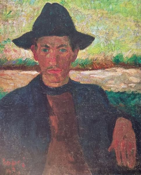 Here we see Istvan Farkas's "Portrait of Countess G. Z." a work of uncertain date, executed in what appears to be gouache or tempera on paper. The Countess, set against an unsettling ground of solid green, confronts us with an expression of frozen detachment. The painting's composition balances a tension between representation and abstraction. Note how the Countess’s features are rendered with crude, almost caricatured strokes, while her hands, disproportionately large, seem to float independently of her body. Farkas uses a restricted palette, limiting himself to blues, browns, and greens. These colours don’t blend; instead, they create a sense of flatness, and the Countess appears devoid of depth. The tree behind the Countess on the right side, an element that feels both arbitrary and symbolic, emphasizes the precariousness of the figure's existence and disrupts our reading of the painting as a straightforward portrait. This disruption destabilizes the traditional role of portraiture, challenging our assumptions about identity and representation. The artist uses formal means to open the artwork to many interpretations.