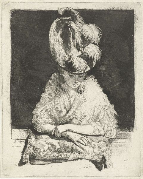 Curator: Before us is James Abbott McNeill Whistler's "Finette," a pencil drawing dating back to 1859. What's your initial take on this portrait? Editor: It feels melancholic, almost haunted. The starkness of the pencil against the paper and the woman's averted gaze contribute to this feeling of quiet resignation. The composition, too, is striking—the figure is dominant, almost looming. Curator: Dominant indeed, especially if we consider the availability and distribution of materials that contributed to its making. Paper became more industrialized in the mid-19th century, leading to increased availability for artists to experiment and produce such a portrait as a reflection of social issues. Editor: That industrial connection is fascinating, but it's hard to ignore Whistler's skill in rendering textures, and he must be acutely aware of formal arrangements. Look at the draping of her gown. See the balance he achieves between detail in the fabric and the relatively empty space. Semiotically, her costume also invites analysis. Her simple costume symbolizes that women belonged at home in this era. Curator: The costume may communicate submission, but I also read defiance in the way her dress overwhelms the smallness of her physical presence; maybe she resists this prescribed idea of women's placement in society, finding power through what she makes, wears, and how her likeness gets circulated as an image. Do you think of this aspect of the woman’s labor—performing femininity for portraits—at all in your own analysis? Editor: Well, such speculation falls outside the rigorous boundaries of formalism, which centers solely on tangible artwork attributes. While cultural background could matter, it's only secondary. And while there are those vague references of women not having many places in public spheres at that time, our discussion needs focus. To be precise, I value her subtle details achieved by pencil strokes! Curator: To bring together what we each focus on: her details achieved with these relatively accessible materials— pencil on paper—speak volumes on gender relations as social material! Editor: Quite an intersection, focusing both on the hand of the artist and its broader connections. A satisfying end to our examination!