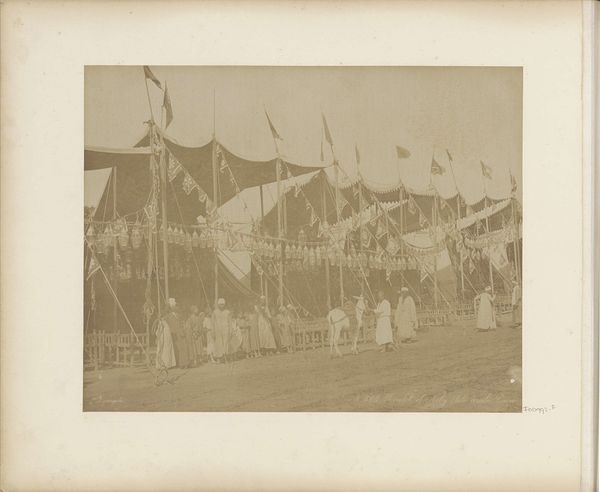 This is Jan Willem Arnold's photograph, "Koninklijk bezoek bij militaire post," taken sometime in the late 19th century. What strikes me first is how the light seems to flatten everything, a hazy monochrome that turns the scene into a kind of stage. Look closely at the figures; they seem almost like cutouts pasted onto the landscape. The sepia tone gives the whole image a feeling of distance, like looking at a memory. I think about how the mechanical process of early photography must have felt to artists at the time, this new way of capturing a moment. Now, focus on that figure holding the parasol. See how its form echoes the shape of the tent in the background? It is details like these, which invite you to pause, slow down, and make connections. It reminds me a bit of Atget, another artist who used photography to capture everyday life with an almost dreamlike quality. Ultimately, this image embraces a sense of quiet observation, of finding beauty in the mundane.